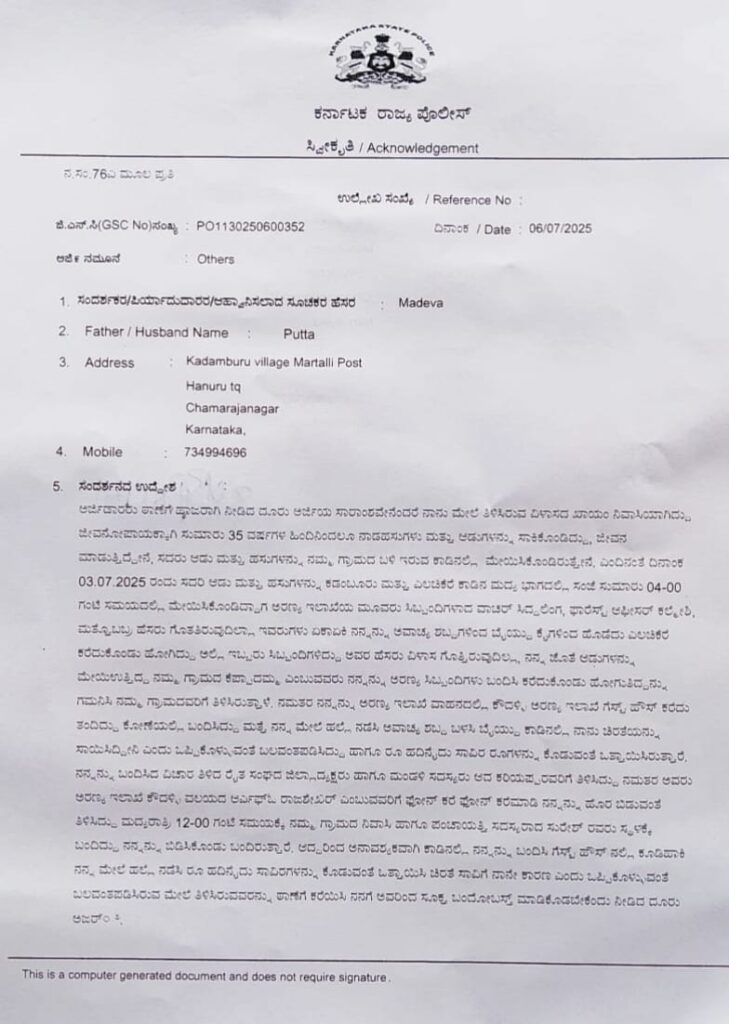 ಹನೂರು :- ತಾಲೂಕಿನ ಕೌದಳ್ಳಿ ವಲಯ ಅರಣ್ಯ ಇಲಾಖೆ ಸಿಬ್ಬಂದಿ ವರ್ಗದವರು ಕಡಂಬುರು ನಿವಾಸಿ ರೈತ ಮಹದೇವ್ ಅವರನ್ನು 3 7 2025 ರಂದು ಎಲಚಿಕೆರೆ ಅರಣ್ಯ ಪ್ರದೇಶದಲ್ಲಿ ಮೇಕೆಗಳು ಮತ್ತು ಜಾನುವಾರಗಳನ್ನು ಮೇಯಿಸುತ್ತಿದ್ದಾಗ ಸ್ಥಳಕ್ಕೆ ಆಗಮಿಸಿದ ಅರಣ್ಯ ಇಲಾಖೆ ಸಿಬ್ಬಂದಿ ವರ್ಗದವರು ಮನಬಂದಂತೆ ಥಳಿಸಿಕರೆದುಕೊಂಡು ಹೋಗಿ ಕೌದಳ್ಳಿ ಗೆಸ್ಟ್ ಹೌಸ್ ನಲ್ಲಿ ಹಲ್ಲೇ ನಡೆಸಿ ದರ್ಪ ನಡೆಸಿರುವ ಬಗ್ಗೆ ಸೂಕ್ತ ಕಾನೂನು ಕ್ರಮ ಕೈಗೊಳ್ಳುವಂತೆ ರಾಮಪುರ ಪೊಲೀಸ್ ಠಾಣೆಗೆ ರೈತ ಮುಖಂಡರ ಜೊತೆ ತೆರಳಿ ಮಹದೇವ್ ಕ್ರಮ ಕೈಗೊಳ್ಳುವಂತೆ ದೂರು ಸಲ್ಲಿಸಿದ್ದಾರೆ….