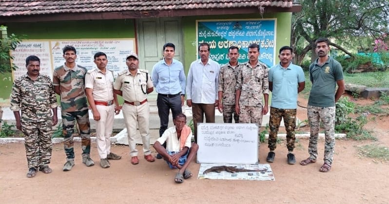 ಹನೂರು :- ಮಲೆಮಹದೇಶ್ವರ ವನ್ಯಜೀವಿ ಧಾಮ ಕೌದಳ್ಳಿ ಅರಣ್ಯ ವಲಯದ ಕರಿಕಲ್ಲುಗುಡ್ಡೆ ಬಯಲು ಅರಣ್ಯ ಪ್ರದೇಶದಲ್ಲಿ ಉಡ ಬೇಟೆಯಾಡಿದ್ದ ಆರೋಪಿಯೊಬ್ಬನನ್ನು ಶನಿವಾರ ಅರಣ್ಯ ಇಲಾಖೆಯ ಅಧಿಕಾರಿಗಳು ಬಂಧಿಸಿದ್ದು, ಪರಾರಿಯಾದ ಮತ್ತೋರ್ವನ ಪತ್ತೆಗೆ ಬಲೆ ಬೀಸಿದ್ದಾರೆ. ತಾಲೂಕಿನ ವಡಕೆಹಳ್ಳ ಗ್ರಾಮದ ಚಿನ್ನಮುತ್ತು (60) ಬಂಧಿತ. ಇದೇ ಗ್ರಾಮದ ಕೊಳಂದೈ ಪರಾರಿಯಾದವ.ಈ ಇಬ್ಬರು ಕರಿಕಲ್ಲುಗುಡ್ಡೆ ಅರಣ್ಯ ಪ್ರದೇಶಕ್ಕೆ ಅಕ್ರಮವಾಗಿ ಪ್ರವೇಶಿಸಿ ಉಡ ಭೇಟೆಯಾಡಿದ್ದರು. ಈ ಬಗ್ಗೆ ದೊರೆತ ಖಚಿತ ಮಾಹಿತಿ ಮೇರೆಗೆ ಆರ್ಎಫ್ಒ ಉಮಾಪತಿ ಅವರು ಹಿರಿಯ ಅಧಿಕಾರಿಗಳ ಮಾರ್ಗದರ್ಶನದಲ್ಲಿ ಸಿಬ್ಬಂದಿಯೊಂದಿಗೆ ಮನೆಯ ಮೇಲೆ ದಾಳಿ ನಡೆಸಿದಾಗ ಚಿನ್ನಮುತ್ತು ಸಿಕ್ಕಿಬಿದ್ದರೆ, ಕೊಳಂದೈ ಪರಾರಿಯಾಗಿದ್ದಾನೆ. ಉಡವನ್ನು ವಶಕ್ಕೆ ಪಡೆದ ಅಧಿಕಾರಿಗಳು ಆರೋಪಿಯನ್ನು ಬಂಧಿಸಿ ನ್ಯಾಯಾಂಗ ಬಂಧನಕ್ಕೆ ನೀಡಲಾಗಿದೆ. ತಲೆಮರೆಸಿಕೊಂಡಿರುವ ಮತ್ತೊಬ್ಬ ಆರೋಪಿ ಬಂಧನಕ್ಕೆ ಬಲೆ ಬೀಸಲಾಗಿದೆ. ದಾಳಿಯಲ್ಲಿ ಸಿಬ್ಬಂದಿಗಳಾದ ಆನಂದ ಹಲಸಪ್ಪ ಗೋಳ, ವಿಕ್ರಮ್, ಮಹದೇವಸ್ವಾಮಿ, ಮಲ್ಲಪ್ಪ ಹಾಗೂ ಮಾದೇಶ್ ಭಾಗವಹಿಸಿದ್ದರು.